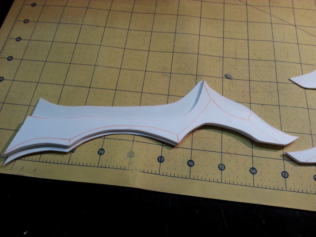I started by pulling the helmet shape from the in game model to get the basic shape. After ripping it apart I made a 2 piece template that would fold together into the shape of the whole helmet all at once. There was a lot of trial and error involved in this, but having a model helped immeasurably. In the end, I transferred my base pattern to 3mm PVC and cut each half out. They might be the craziest looking patterns ive ever used!